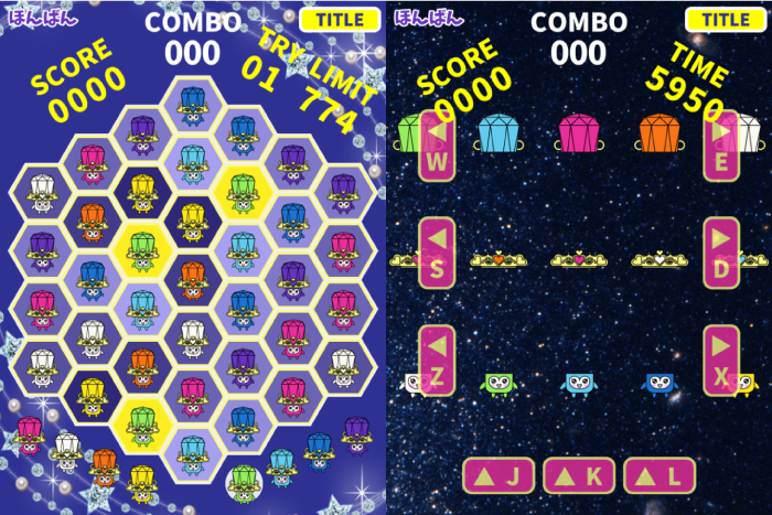 (右)ファクトリーは、正しいフェアリートーンを組み立てるゲームです。色が合うまで横ボタンでスクロールさせて、同じ色が並んだら縦ボタンで合体させます。
