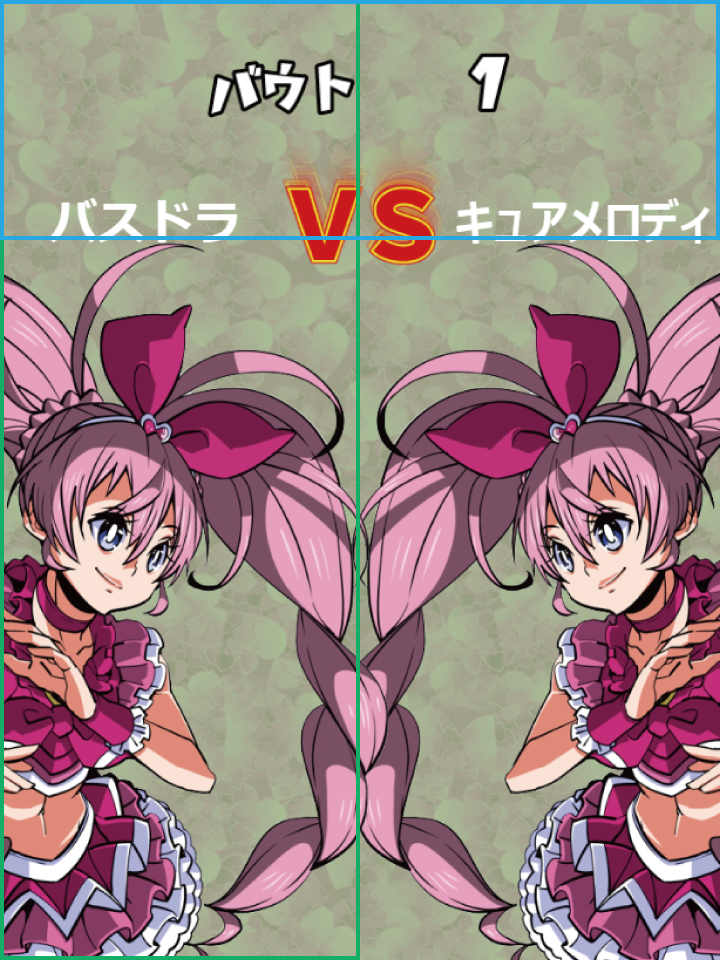 対戦前に対面した絵が表示されます。キャラクタが2人表示されますが、多少重なっても良いと思っています。ギリギリに、顔などの重要な部分がこないようにお願いします。重なった場合はプレイヤー側(左)が上に表示されます。