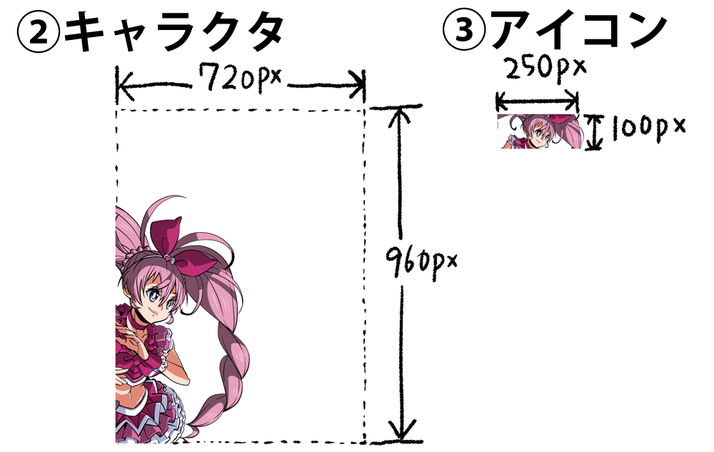 ・使用キャラクタ選択時のボタンなどにも使いますので、切り抜いた時に横長になるようにお願いします。